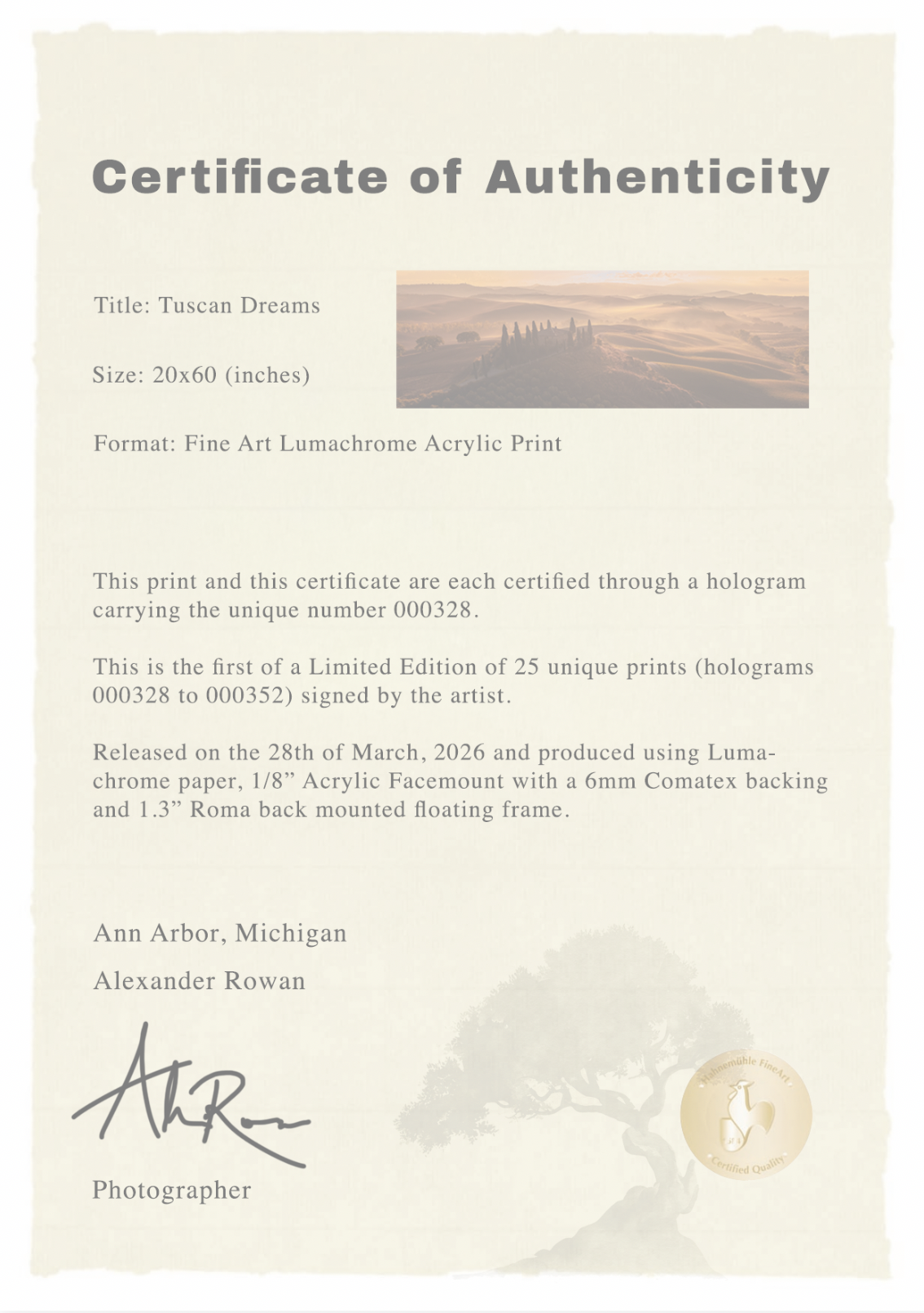 Signed & Numbered for Authenticity - Every print is signed by the artist and sequentially numbered, certifying its authenticity. A Certificate of Authenticity is also provided for every work produced by A Rowan Gallery.